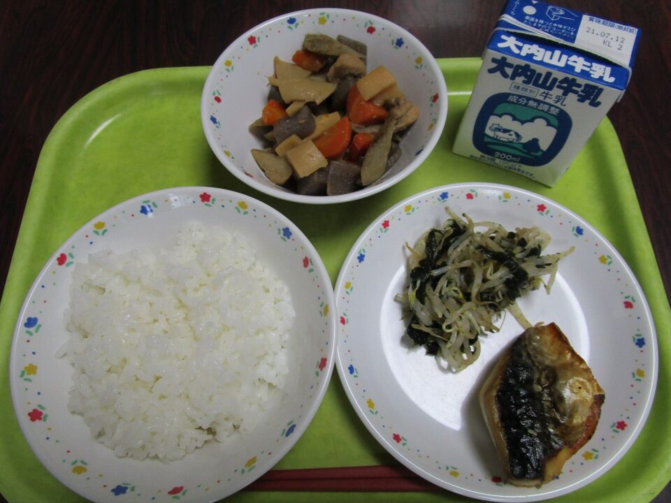 今日の給食の献立は、ご飯、牛乳、さばの塩焼き、もやしのいそ和え、筑前煮でした。
