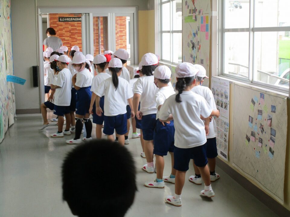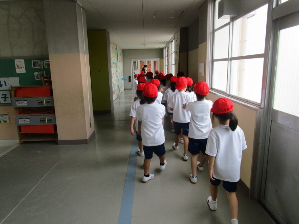 1年生は、ようやく運動会の練習が終わり、日常の体育が始まります。体育館で、マット運動の練習のようです。