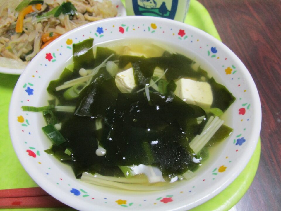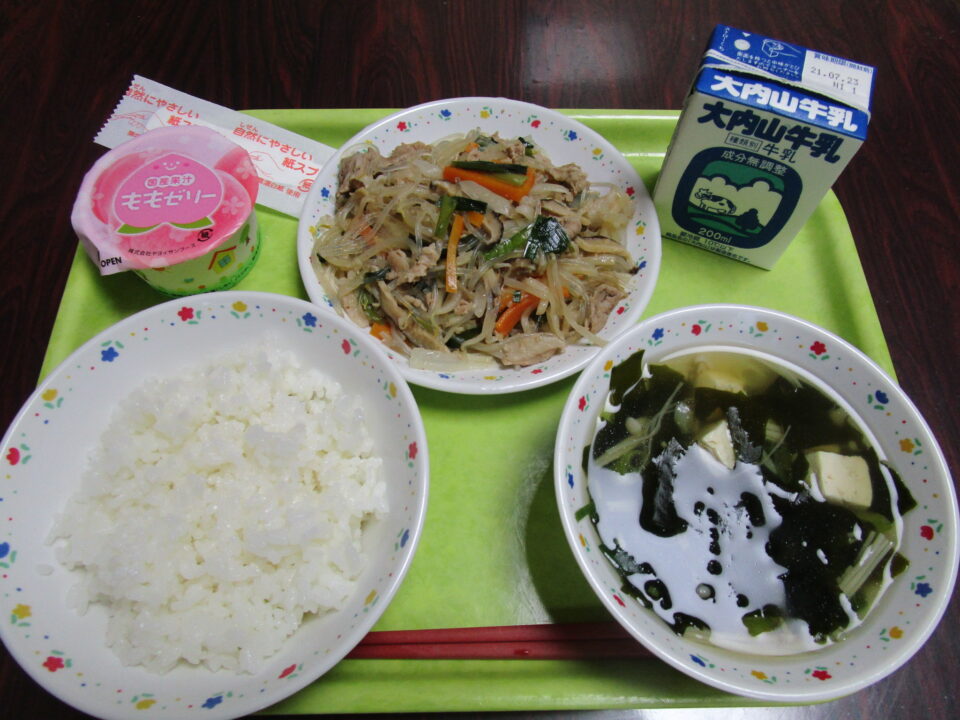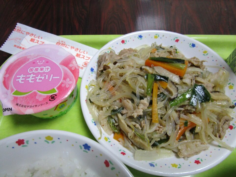 ご飯、牛乳、チャプチェ、わかめスープ、ピーチゼリー でした。