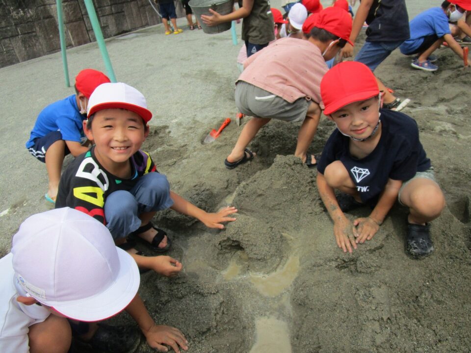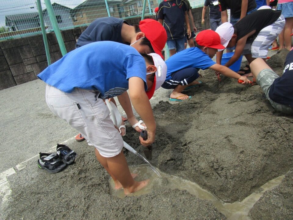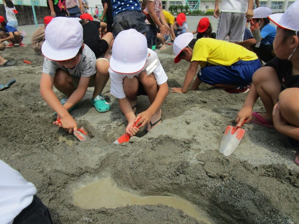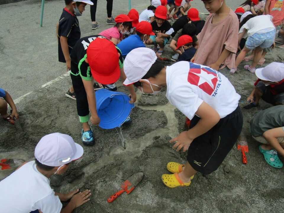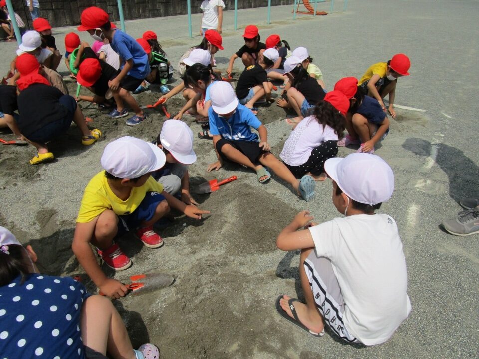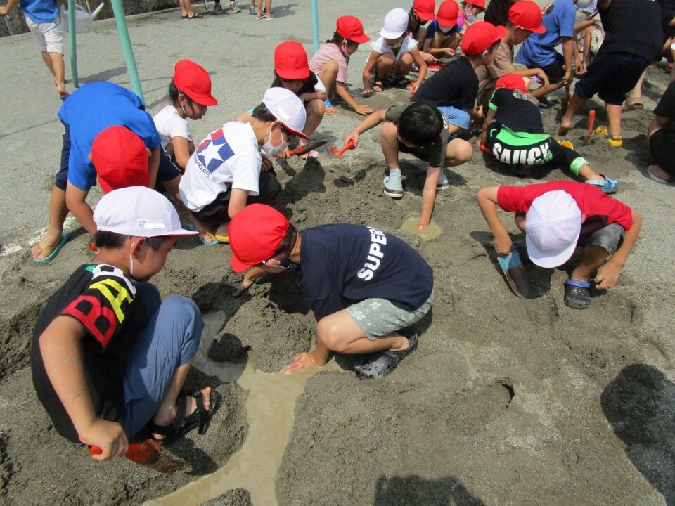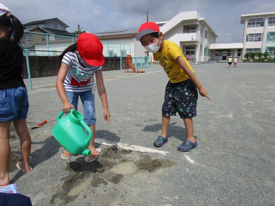 年生ねんせいでは、生活科せいかつか「なつとなかよし」「・おもしろいあそびがいっぱい」の学習がくしゅうで、砂場すなばみず使つかいながら自分じぶんたちでかんがえてあそびました。