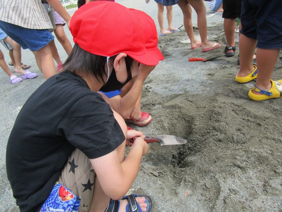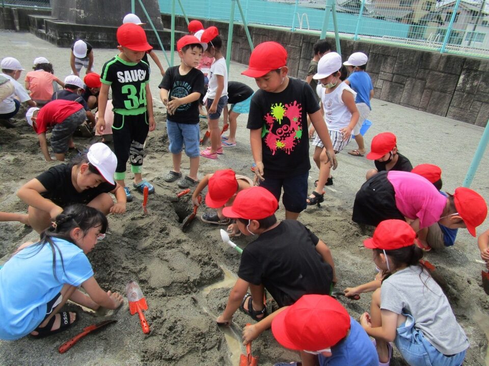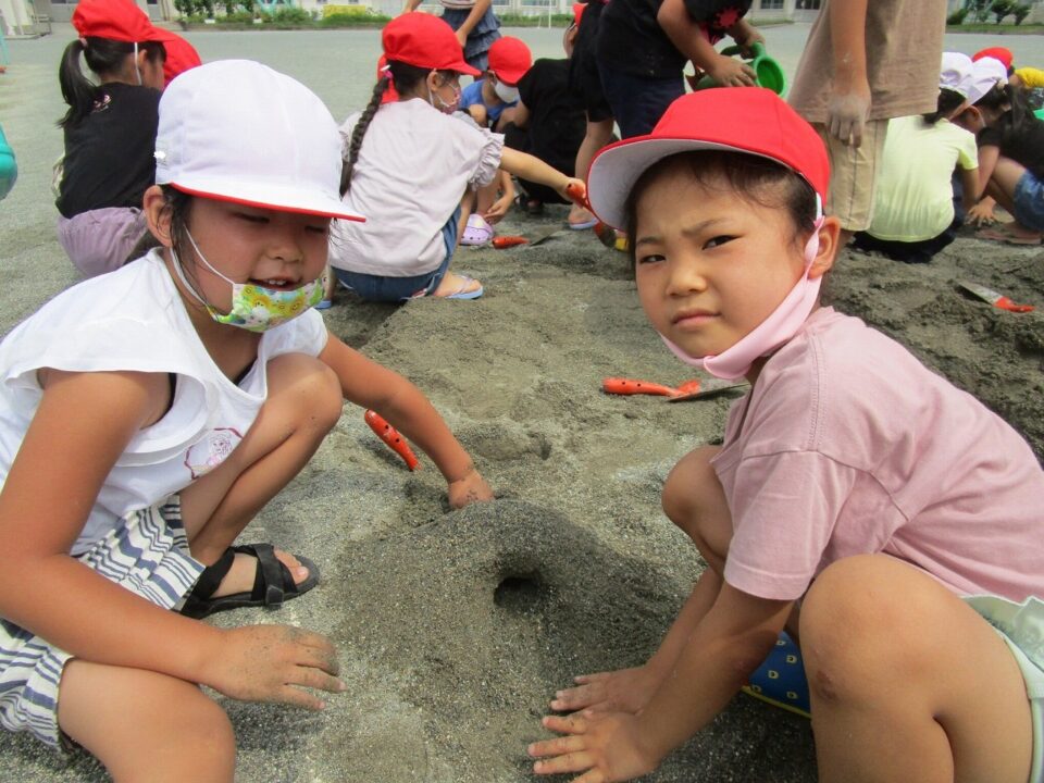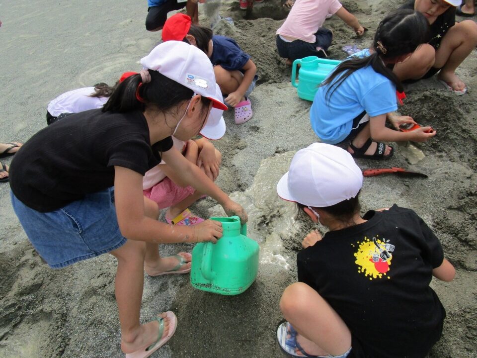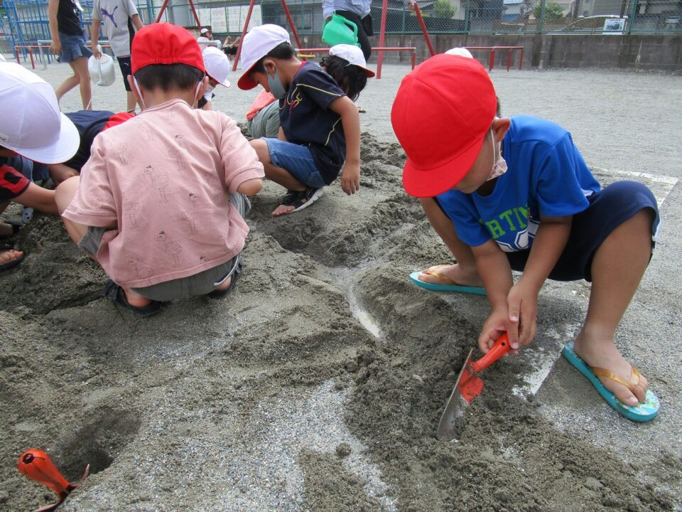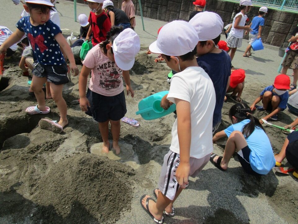 年生ねんせいでは、生活科せいかつか「なつとなかよし」「・おもしろいあそびがいっぱい」の学習がくしゅうで、砂場すなばみず使つかいながら自分じぶんたちでかんがえてあそびました。