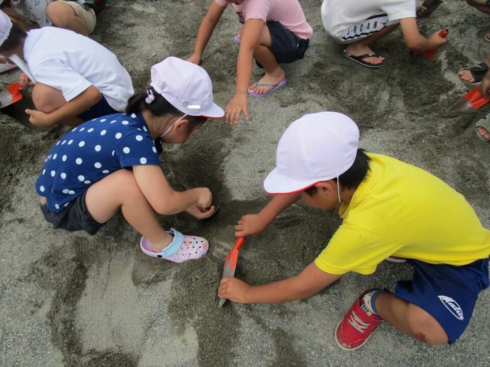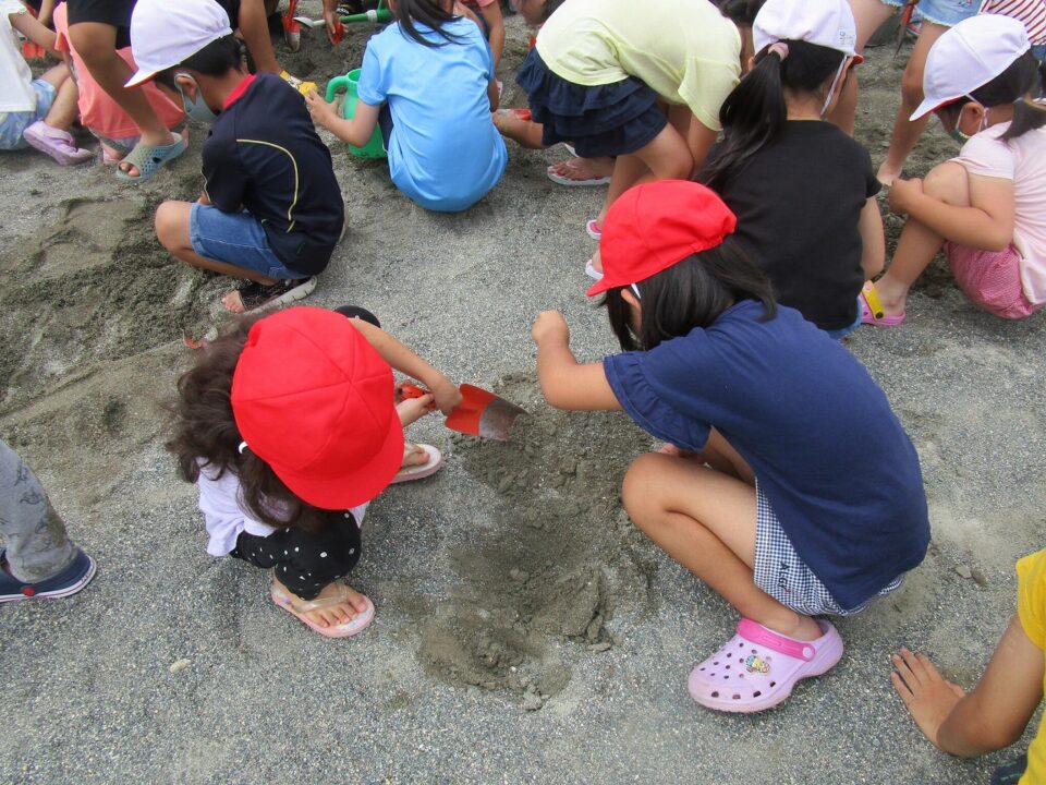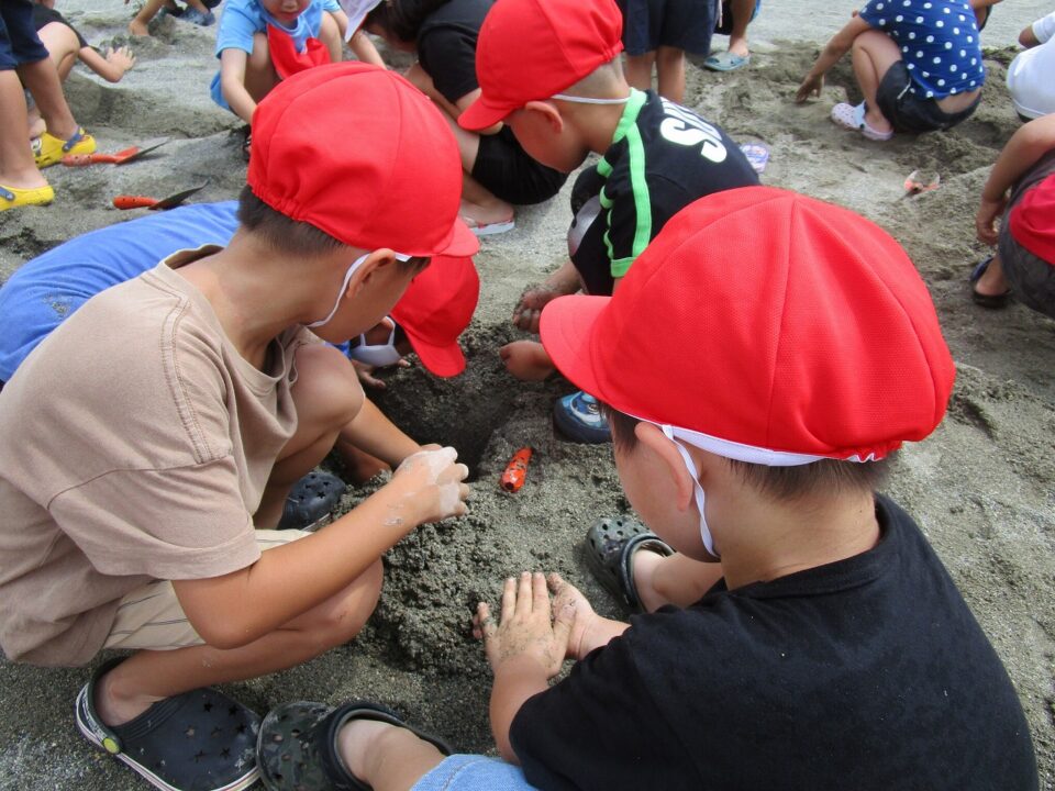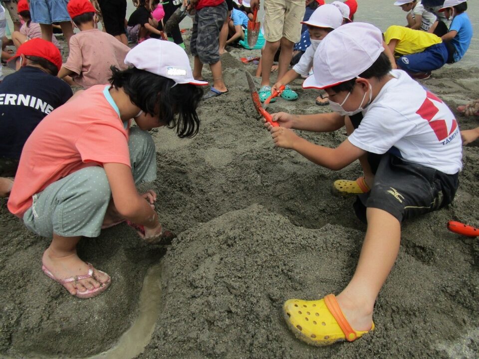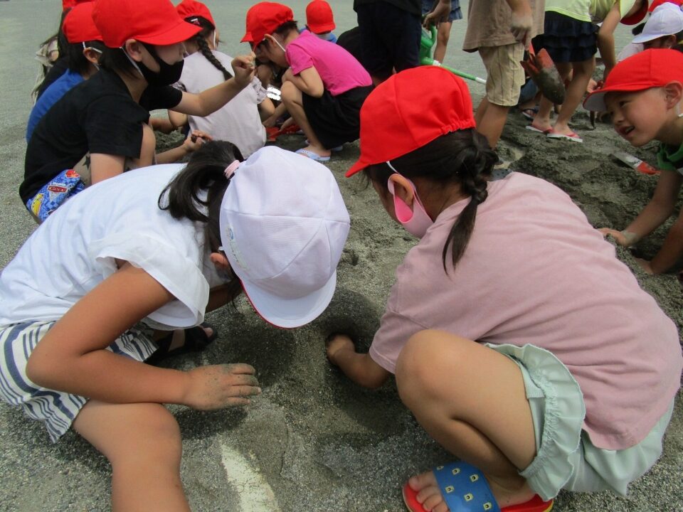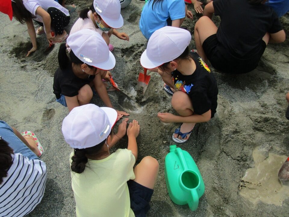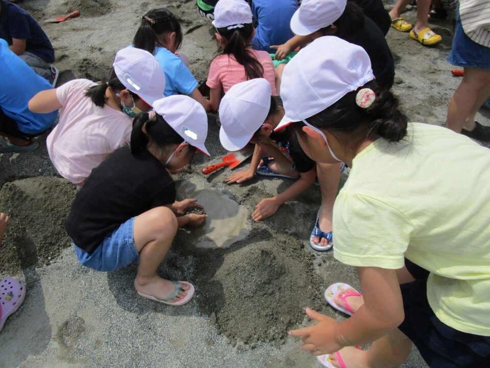 年生ねんせいでは、生活科せいかつか「なつとなかよし」「・おもしろいあそびがいっぱい」の学習がくしゅうで、砂場すなばみず使つかいながら自分じぶんたちでかんがえてあそびました。