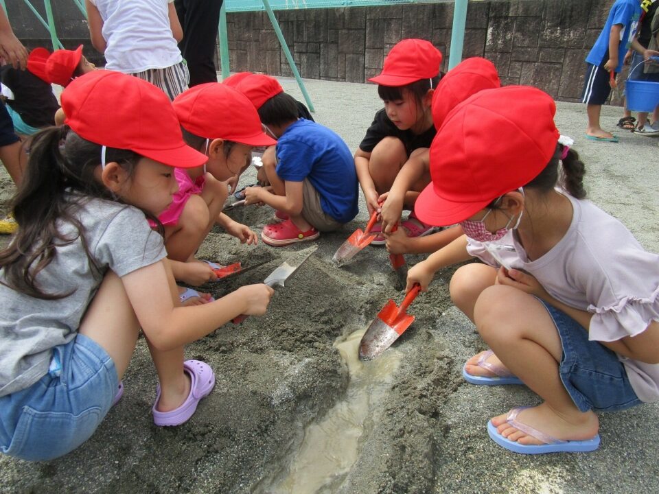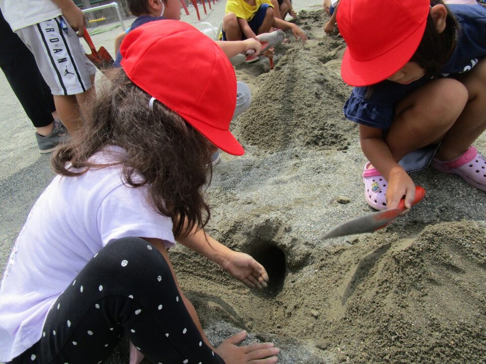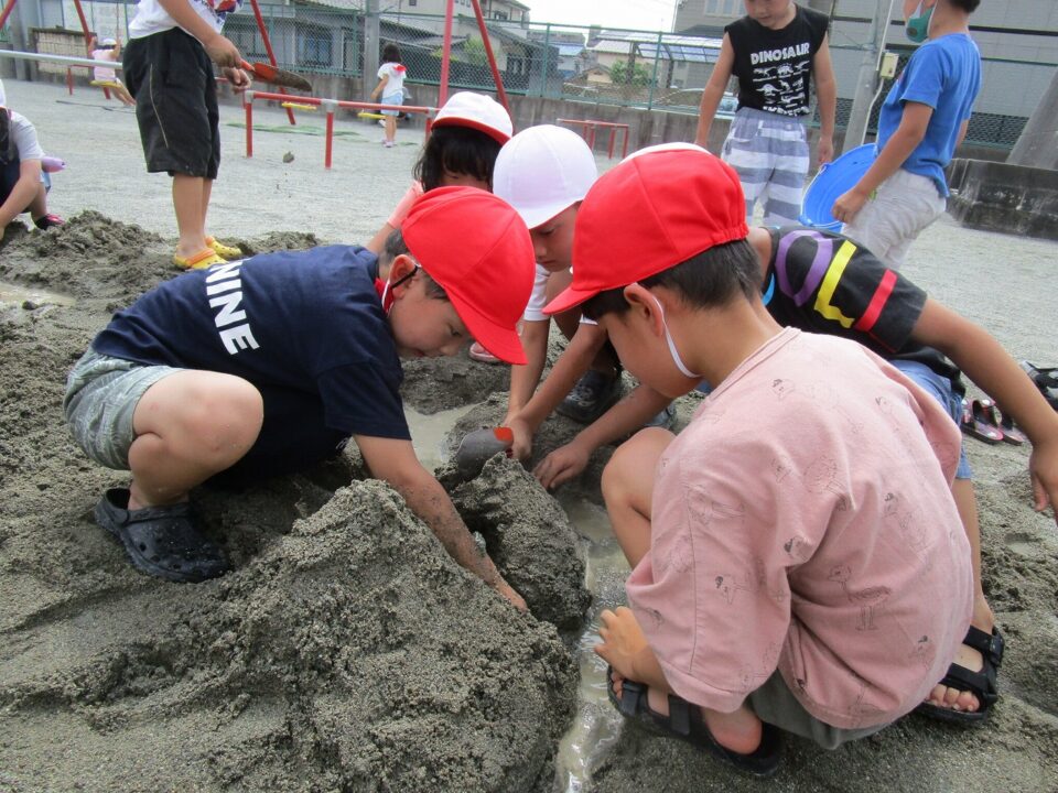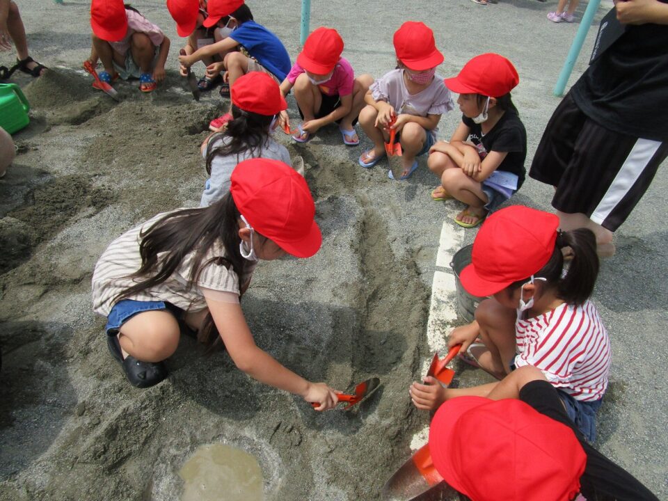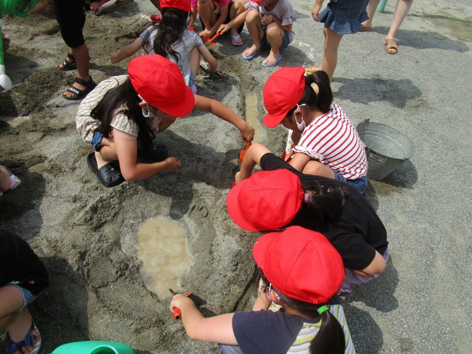 やまつくったり、みずながしてながれる様子ようすたり、トンネルをつくったりと、どもたちはあそびをとおしてまなぶことがたくさんあります。
