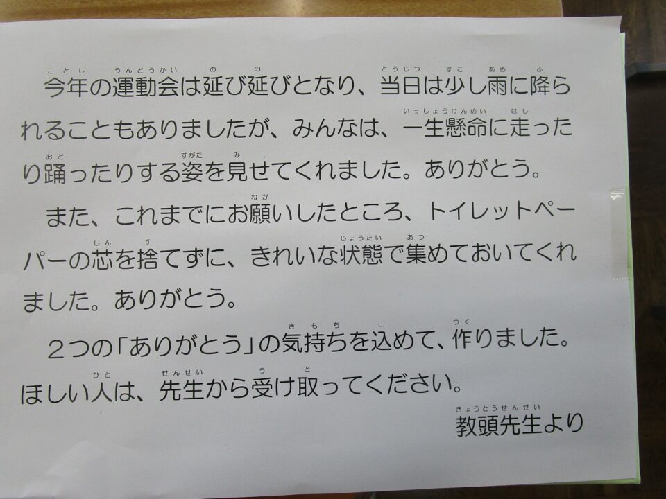 今日は、全校のみなさんに教頭先生からプレゼントがありました。