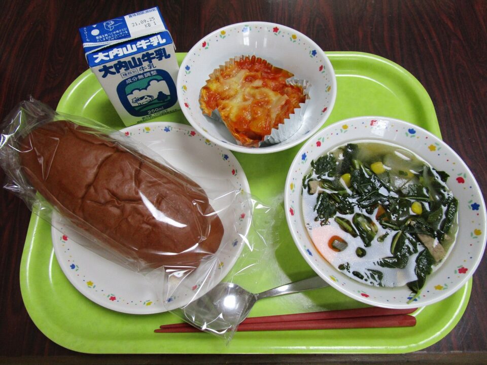黒糖パン、牛乳、ミートグラタン、モロヘイヤスープでした。