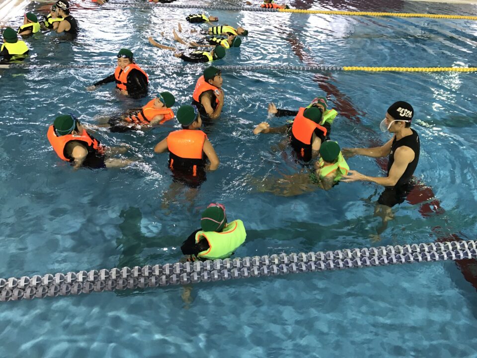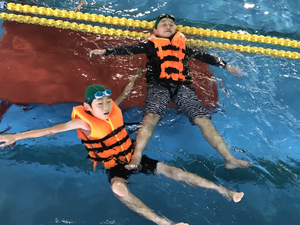 とにかく、仰向けになり、鼻と口を水の外に出すことで、呼吸ができるようにすること。そして、浮いて助けを待つ!!