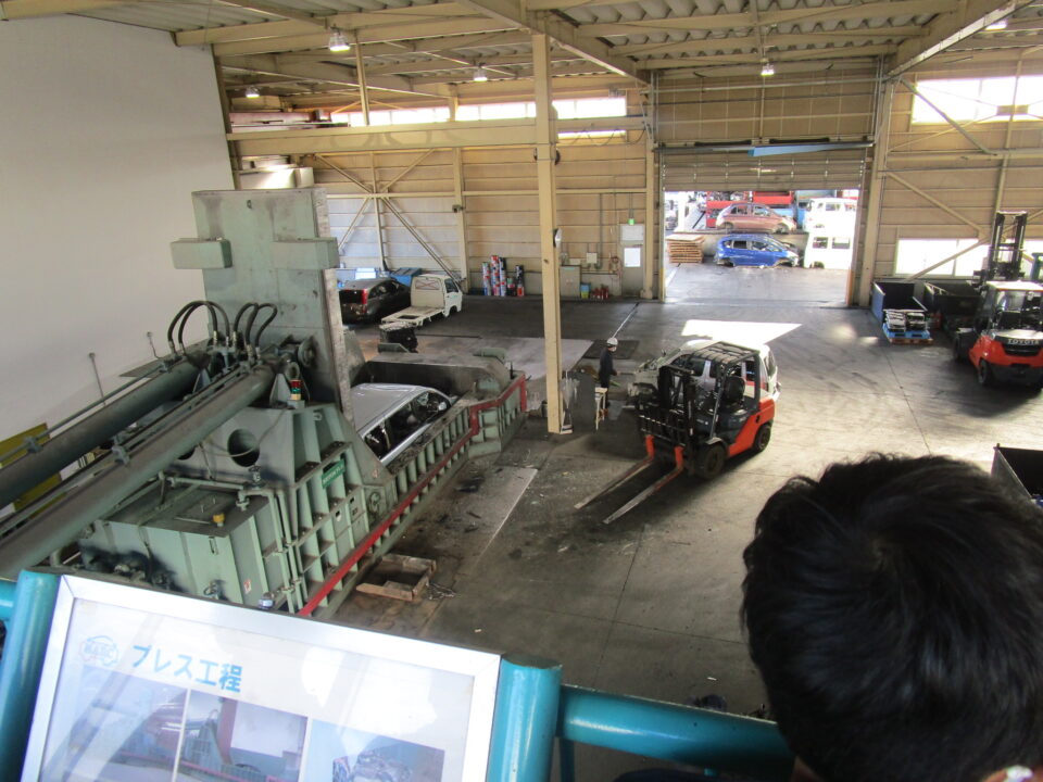 実際に車をプレスするところを見せてもらいました。