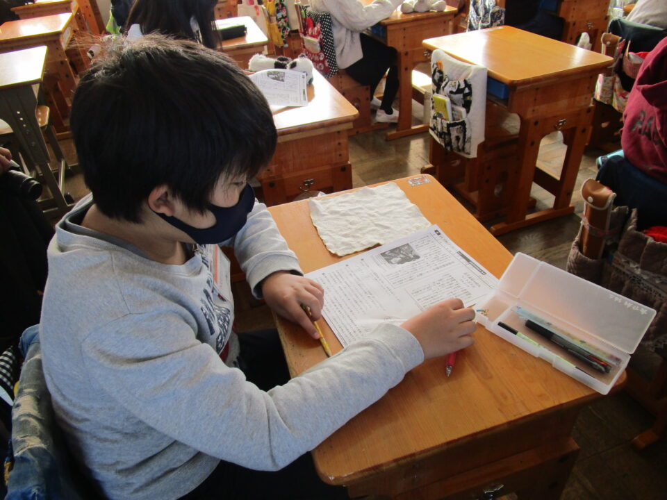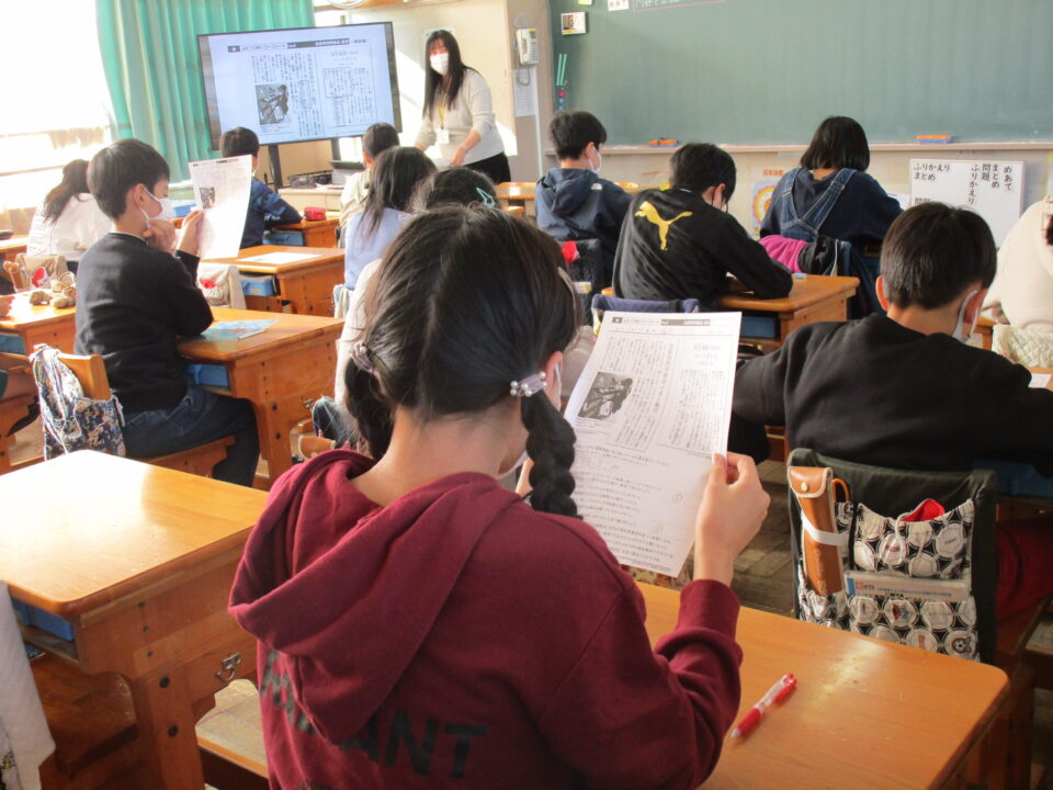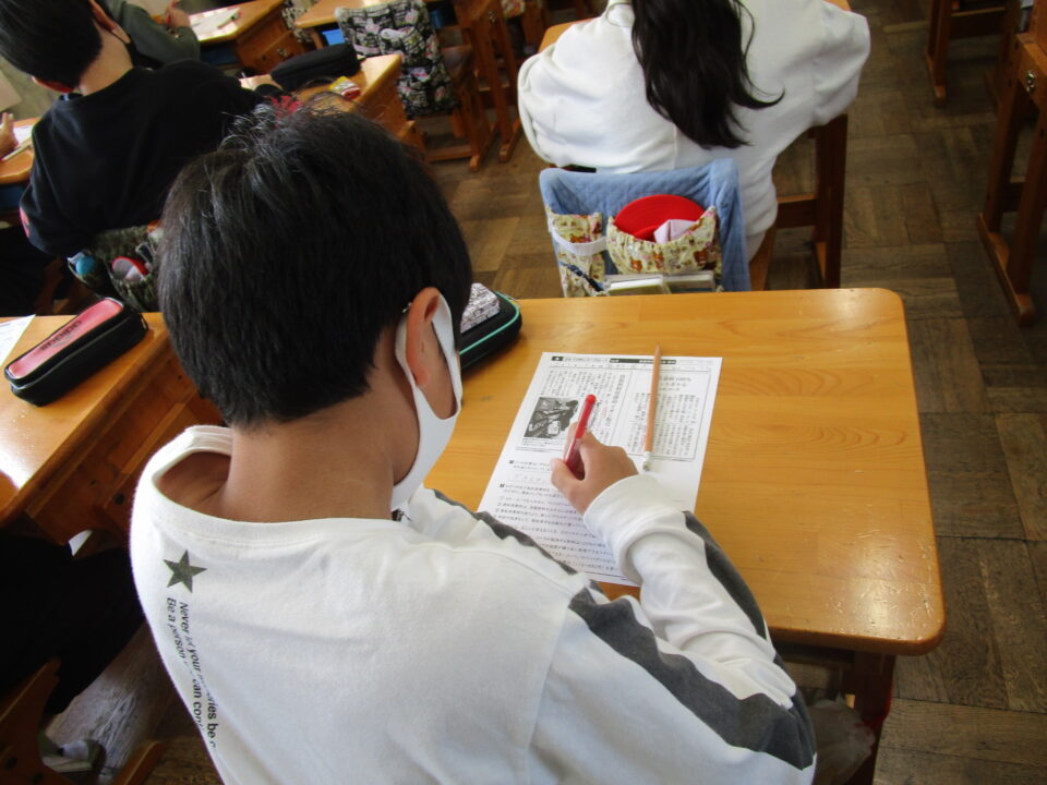 6年生は前期初めから、5年生、4年生は後期から読売新聞の『よむYOMUワークシート』を活用しています。これは、新聞記事を読み取る問題となっています。