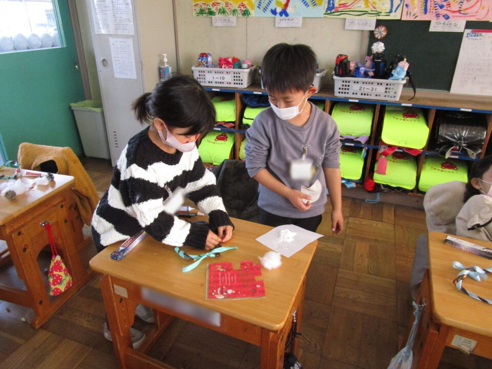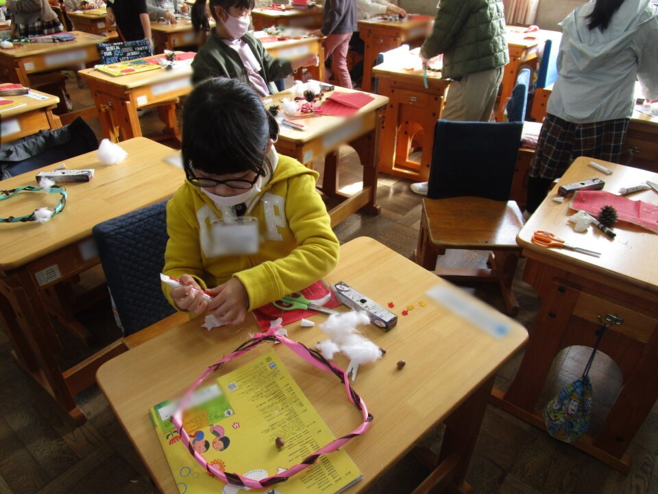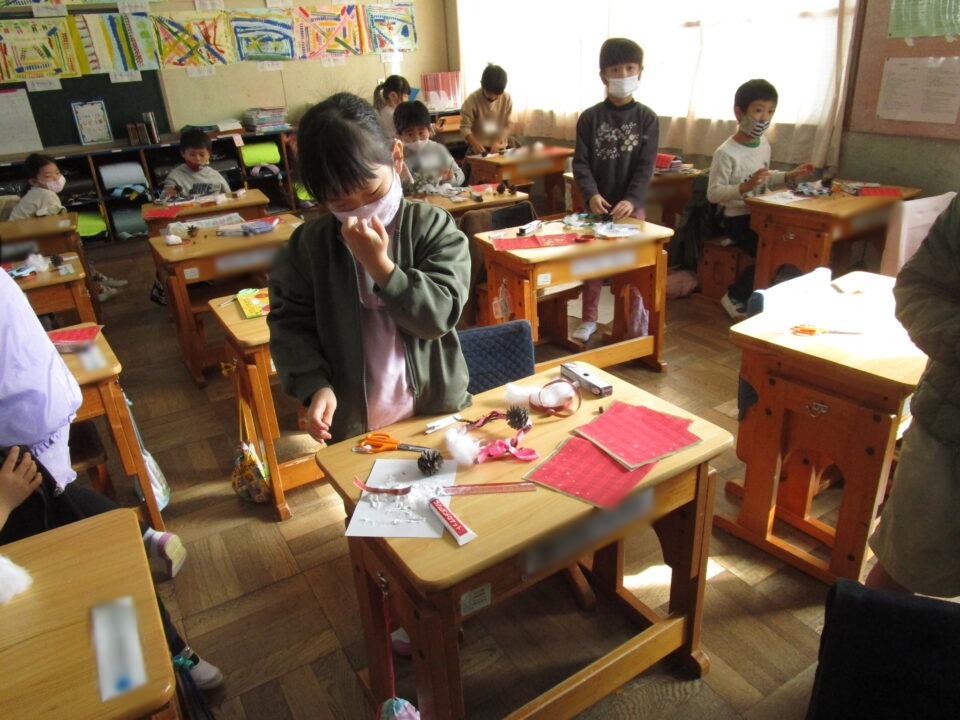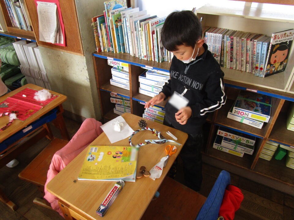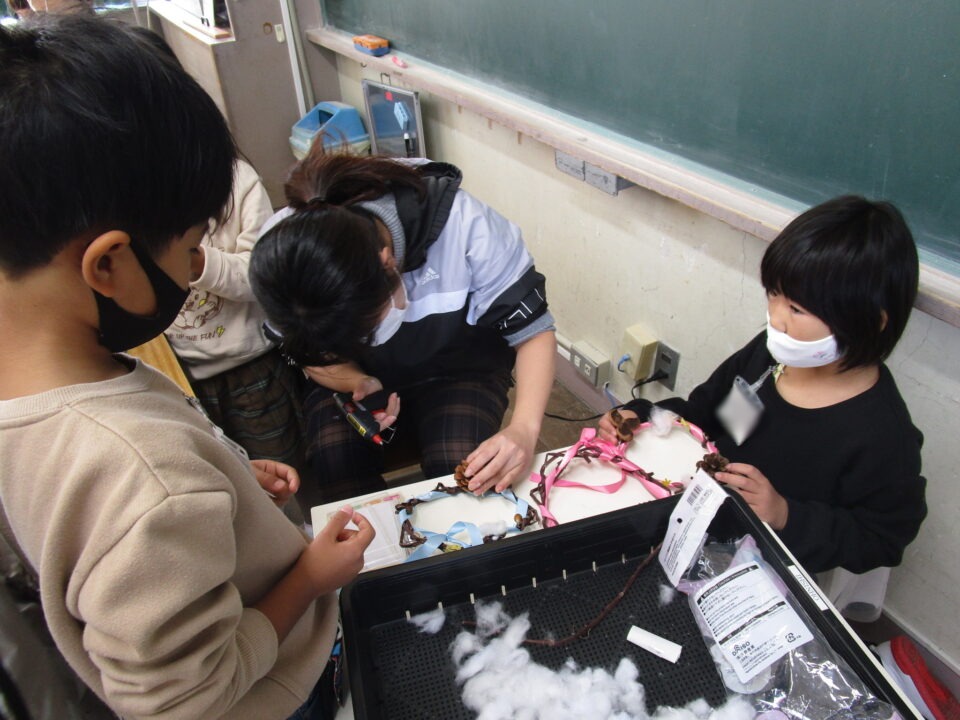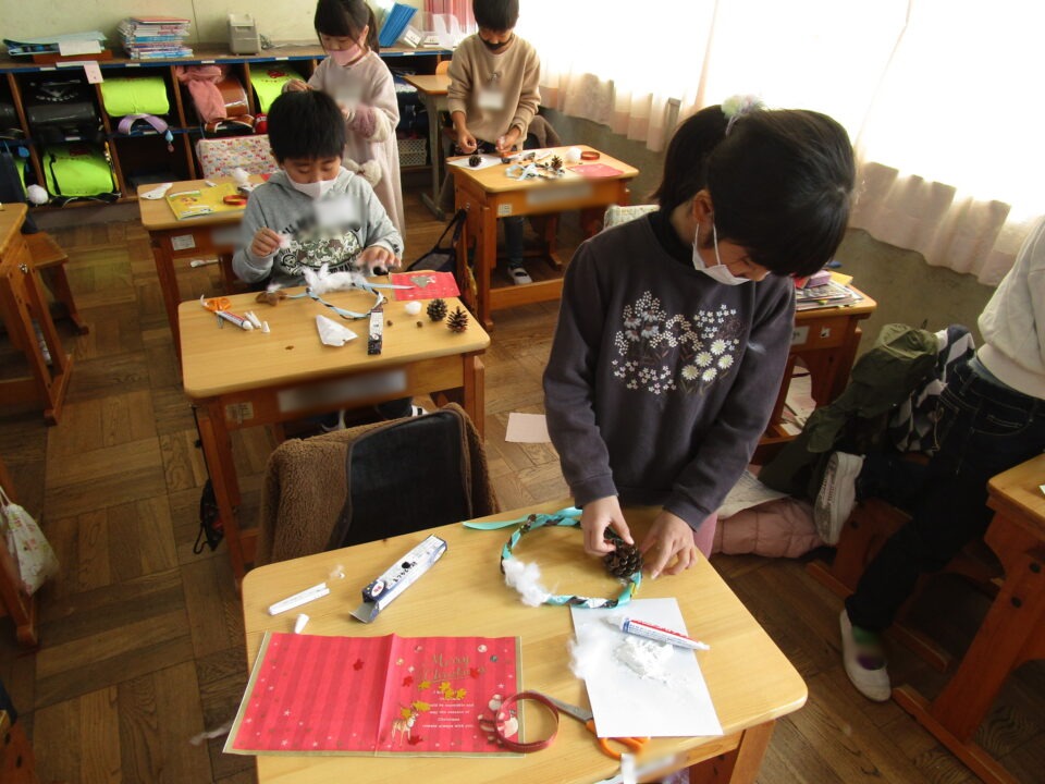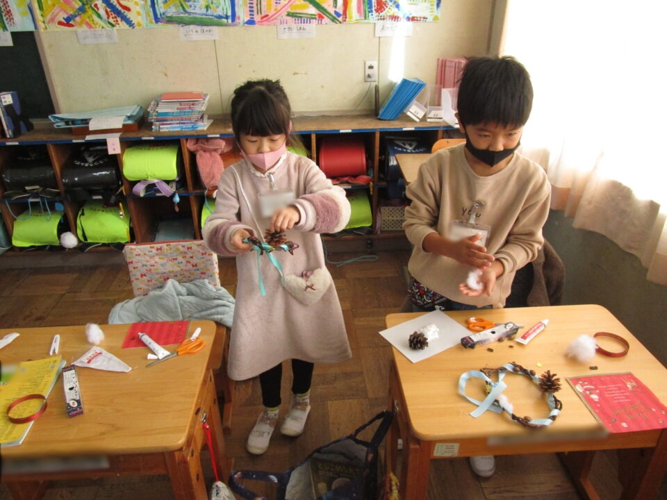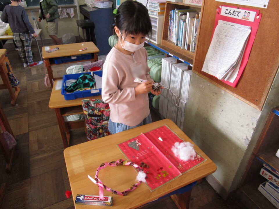 先日、生活科で収穫したさつまいものつるや、松ぼっくり、どんぐり、畑で採れた綿なども使い、つるのリースにリボンを巻き付けたところへ飾りつけをしていました。