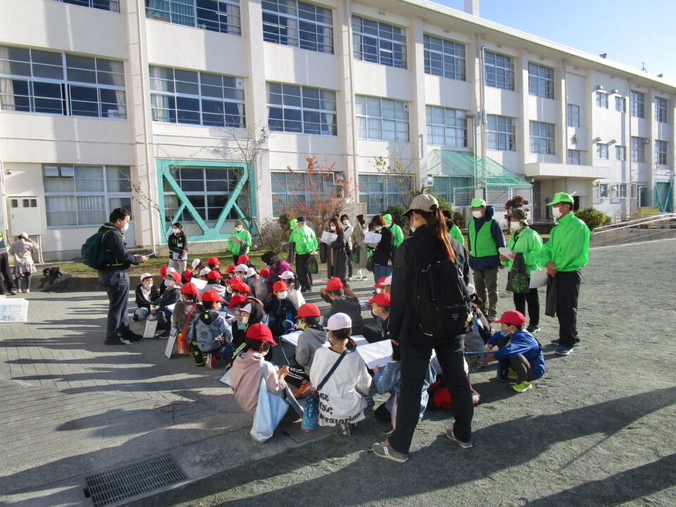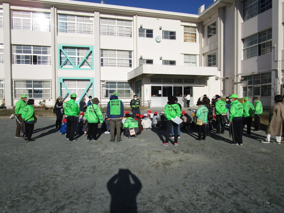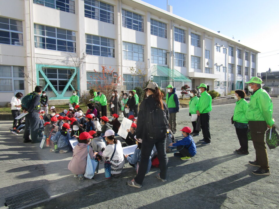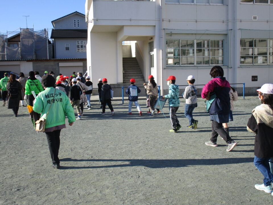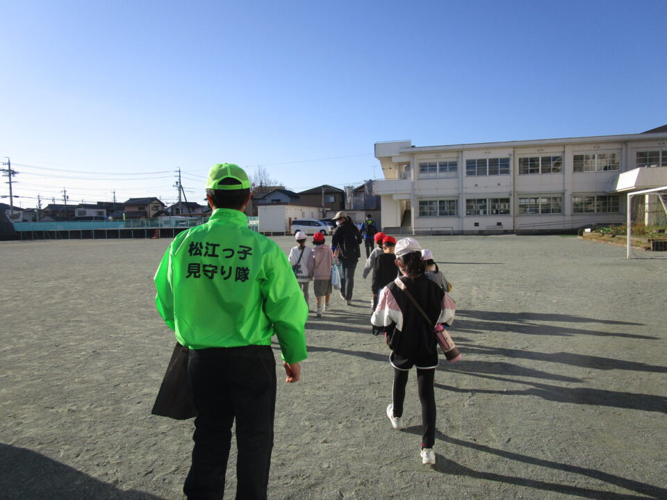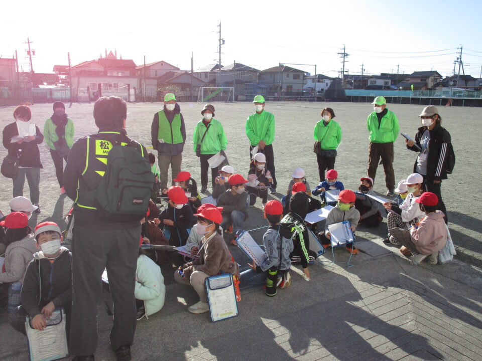 松江小学校まつえしょうがっこう見守みまもたい方々かたがた保護者ほごしゃかた松阪市役所まつさかしやくしょ方々かたがた、と一緒いっしょ出発しゅっぱつです。