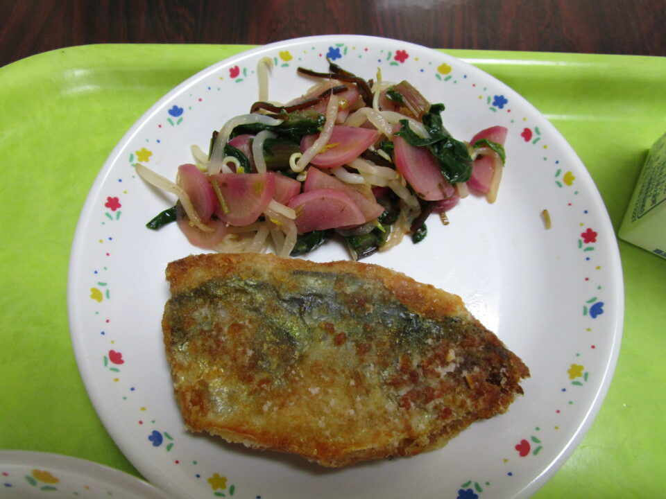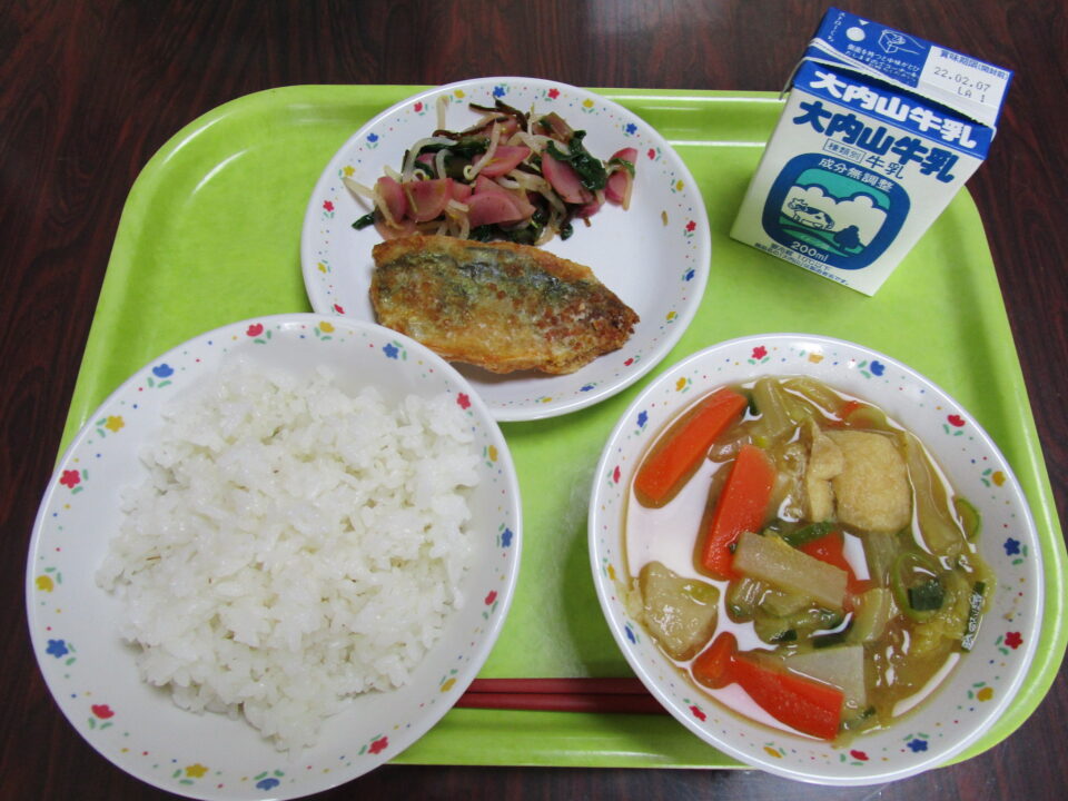 ご飯(麦入り)、牛乳、あじの竜田揚げ、松阪赤菜の塩昆布和え、まごころぽかぽか汁と豪華版でした。