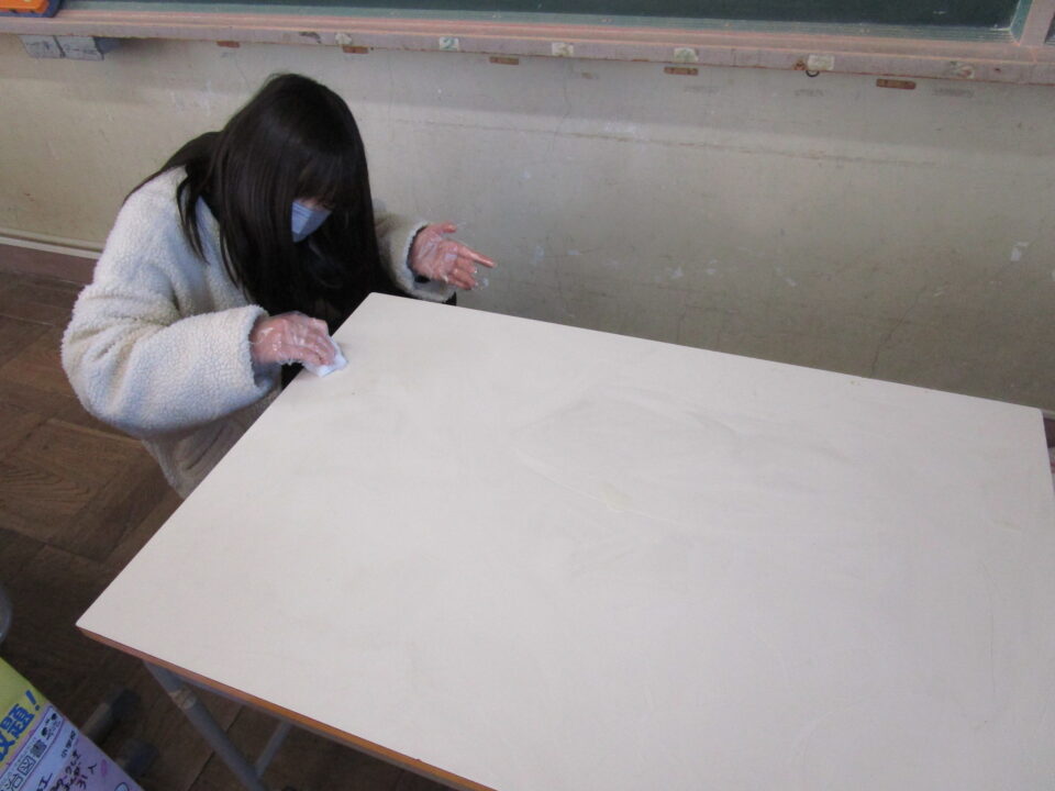 1年生教室をのぞくと、給食委員会の5年生の子が、一生懸命、給食台を磨いてくれていました。