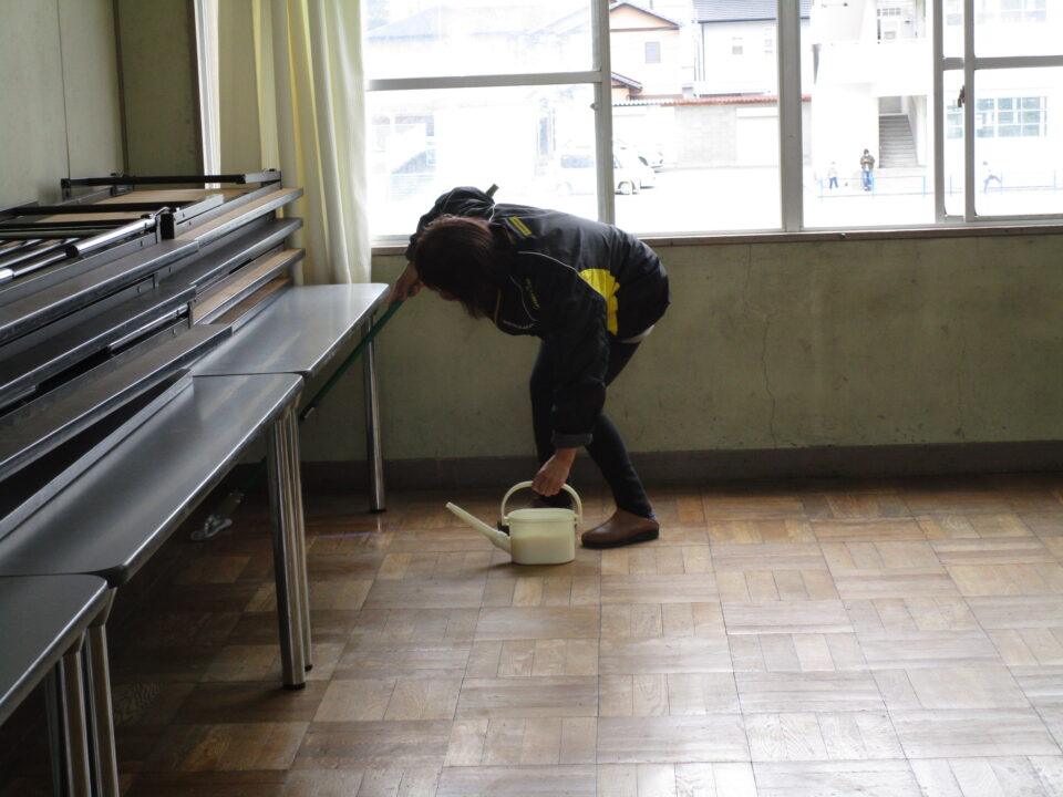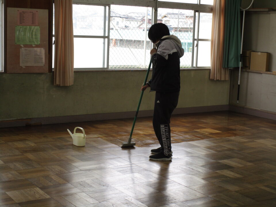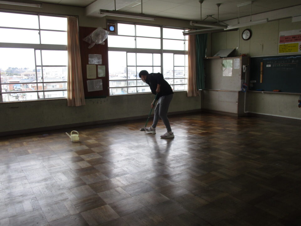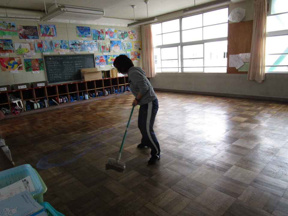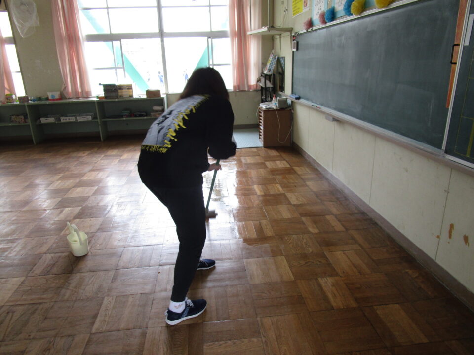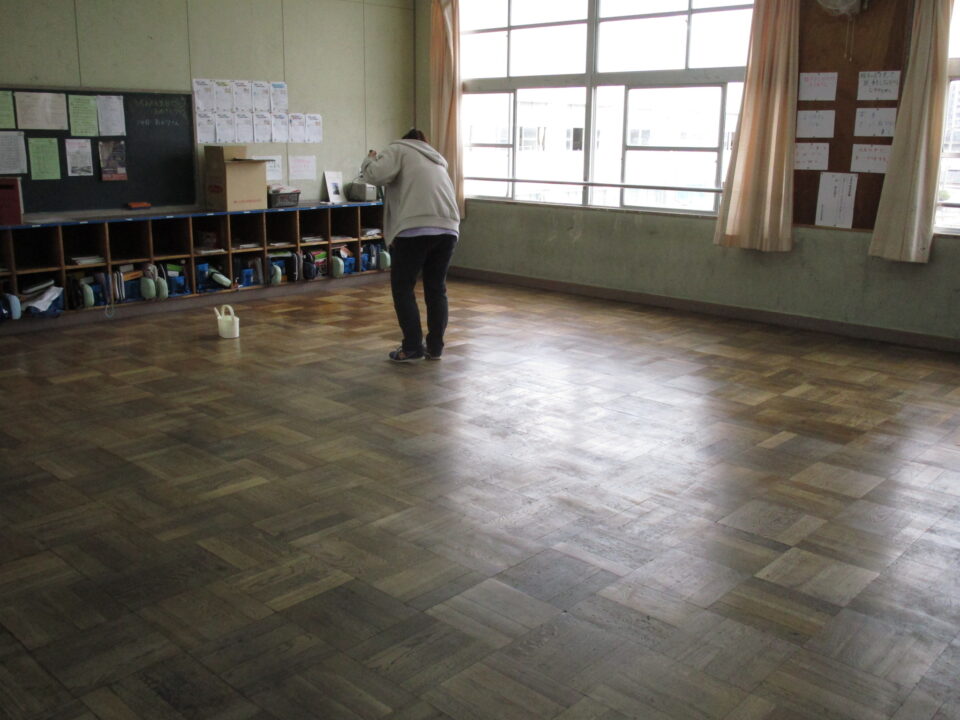 これまでは、6年生の奉仕作業で行ってきましたが、今年は、先生たちで行いました。子どもたちには、教室のものを廊下に出すまでをしてもらい、子どもたちが帰った後、校内全部の教室を分担してワックスがけしました。