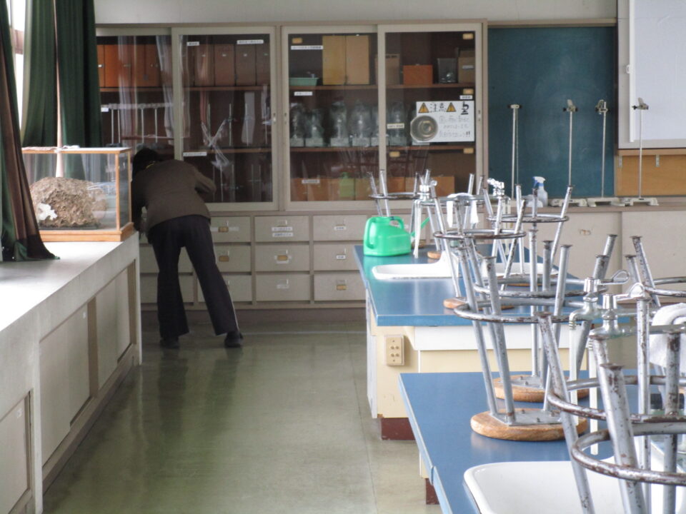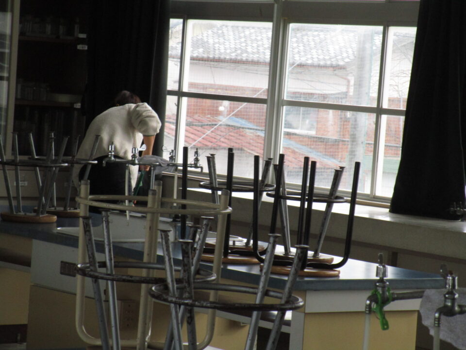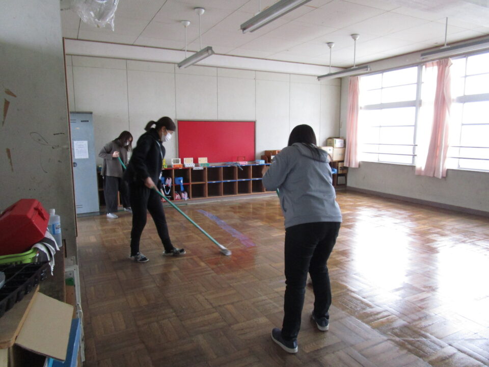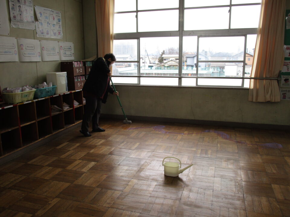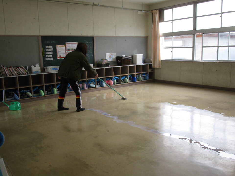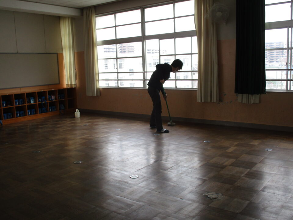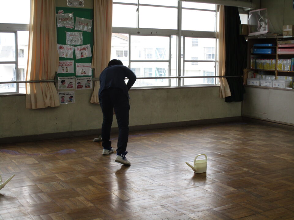 これまでは、6年生の奉仕作業で行ってきましたが、今年は、先生たちで行いました。子どもたちには、教室のものを廊下に出すまでをしてもらい、子どもたちが帰った後、校内全部の教室を分担してワックスがけしました。