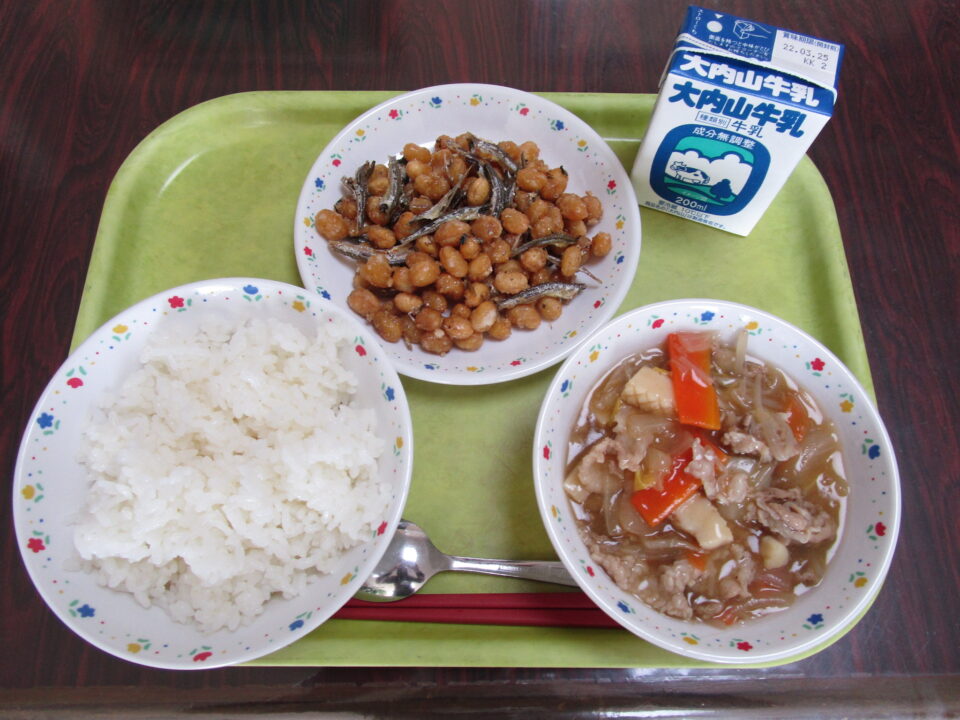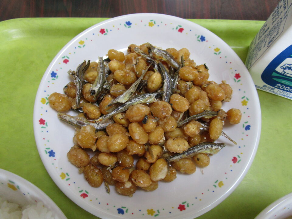 今日の給食は、中華飯ちゅうかはん牛乳ぎゅうにゅう小魚入こざかないりフライビーンズでした。