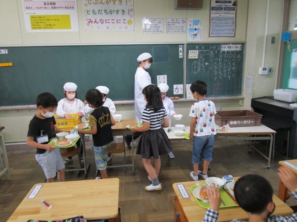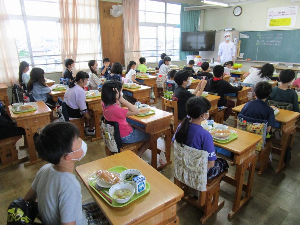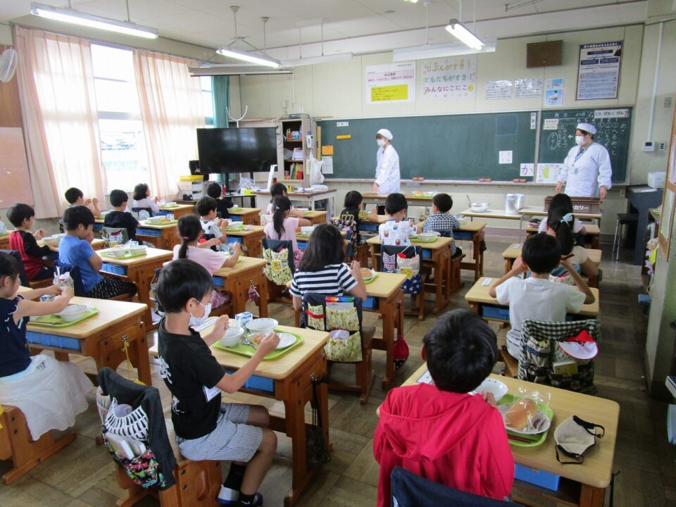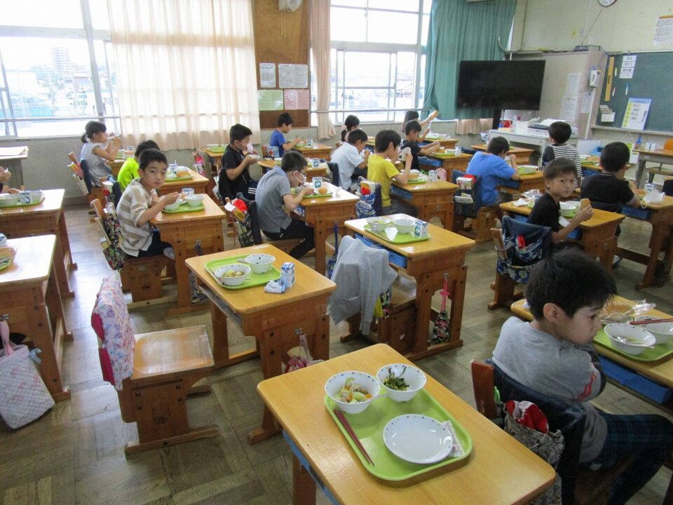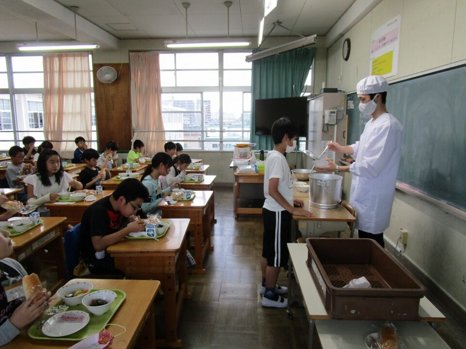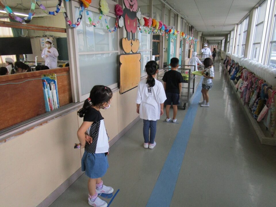 給食きゅうしょく一人ひとりひとりセルフサービスしきならんでもらいます。ならときひととの間隔かんかくをしっかりとっています。らすときやおかわりするときげているのところに先生せんせい順番じゅんばんにまわったり、まえへマスクをつけて、あいだけて先生せんせいところき、らしたり、おかわりしたりとさまざまな工夫くふうをしています。