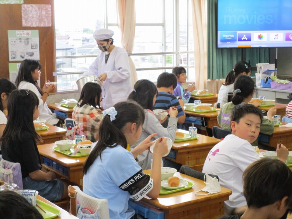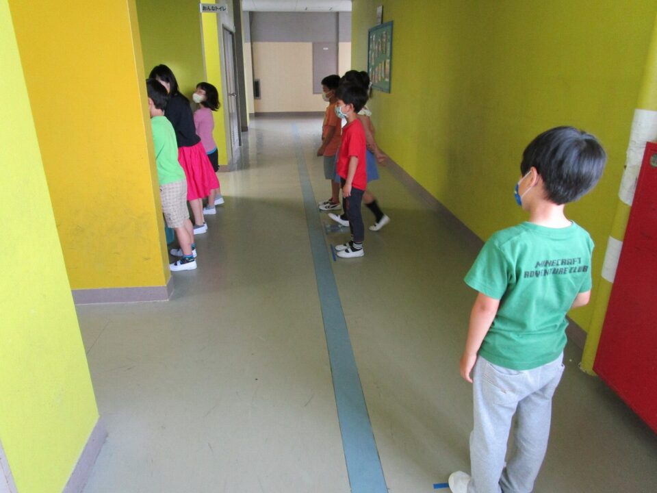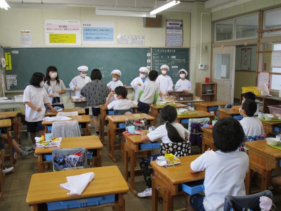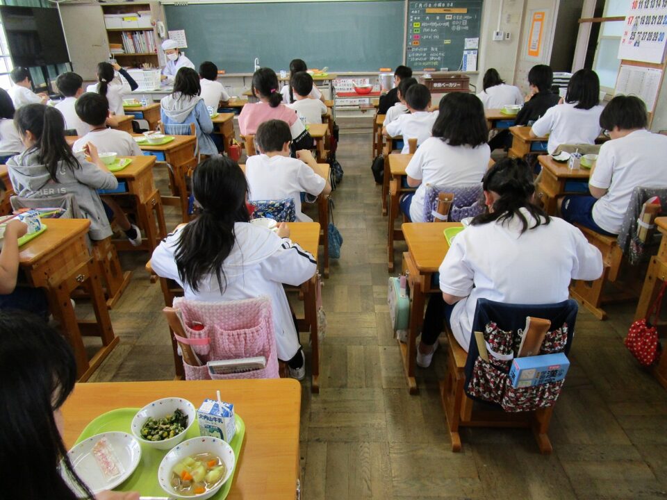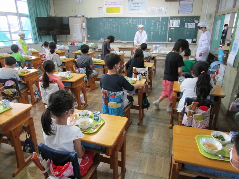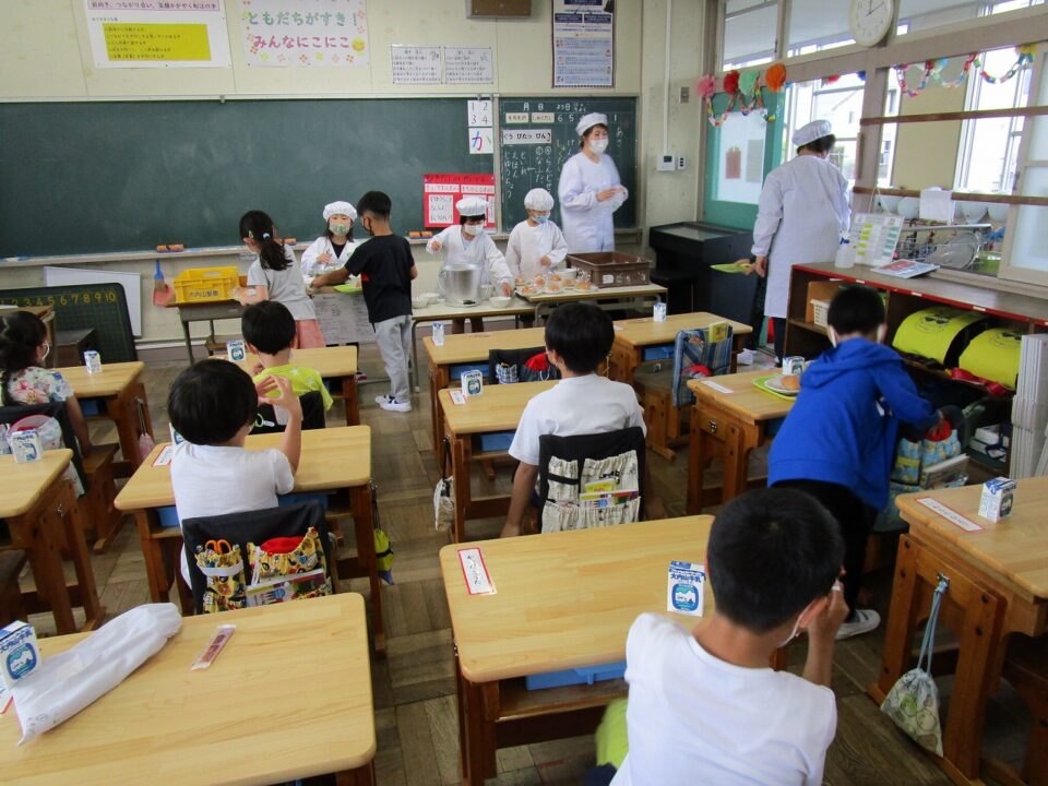 給食きゅうしょく一人ひとりひとりセルフサービスしきならんでもらいます。ならときひととの間隔かんかくをしっかりとっています。らすときやおかわりするときげているのところに先生せんせい順番じゅんばんにまわったり、まえへマスクをつけて、あいだけて先生せんせいところき、らしたり、おかわりしたりとさまざまな工夫くふうをしています。