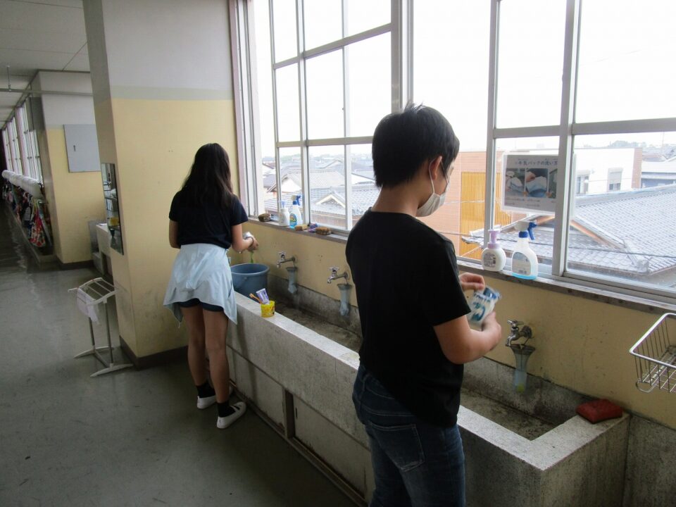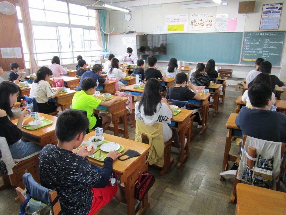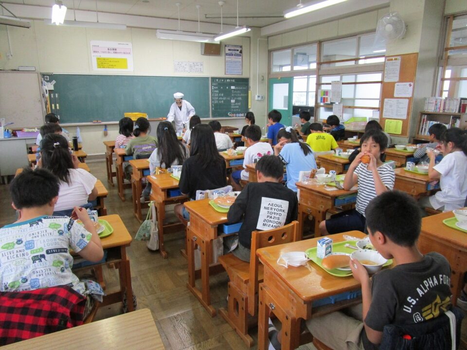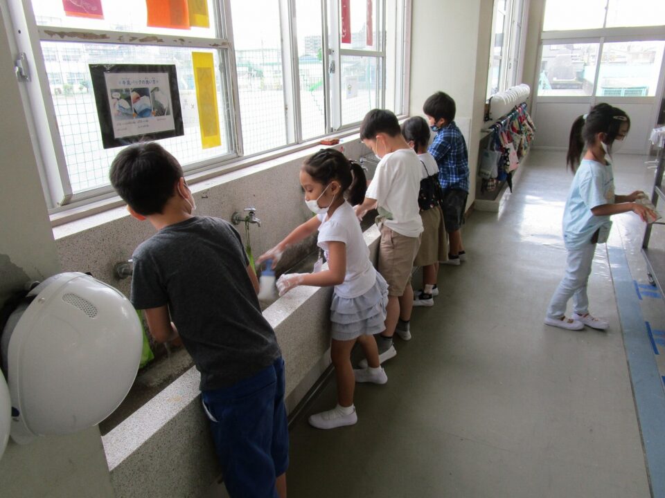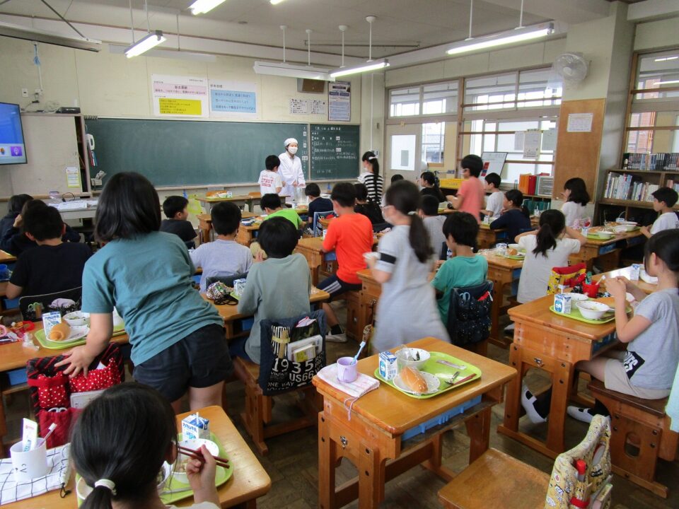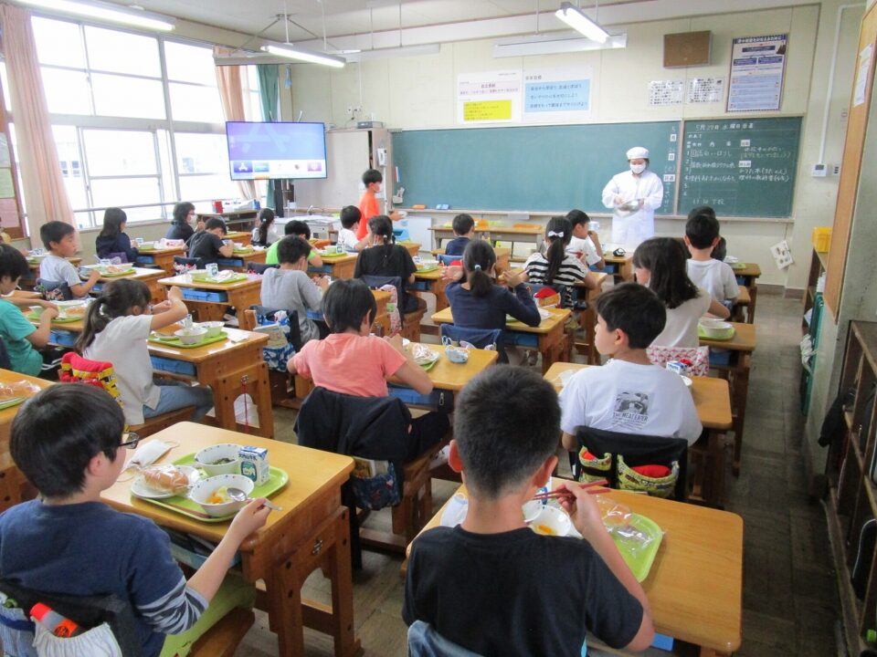 給食きゅうしょく一人ひとりひとりセルフサービスしきならんでもらいます。ならときひととの間隔かんかくをしっかりとっています。らすときやおかわりするときげているのところに先生せんせい順番じゅんばんにまわったり、まえへマスクをつけて、あいだけて先生せんせいところき、らしたり、おかわりしたりとさまざまな工夫くふうをしています。
