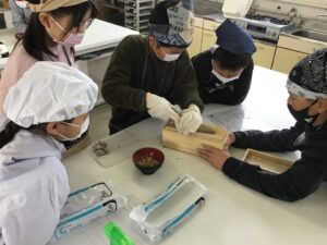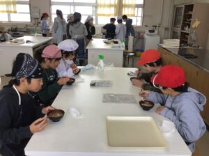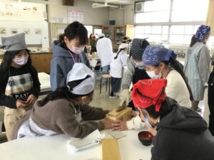 5年生の味噌汁づくりの調理実習。出汁をとるために、鰹節を実際に削るところから始めました。