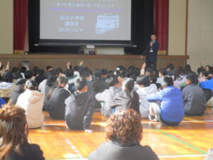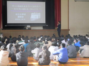 授業参観のあとは人権講演会。4・5・6年生の子どもたちと保護者の皆さまにご参加いただき、「いっしょに考えよう SNS・インターネットの正しい使い方」をテーマに約1時間の講演を聞きました。