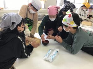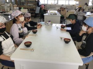 今日の家庭室も削りたての鰹節の香りがただよい、おいしい味噌汁をつくることができたようです。