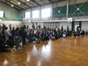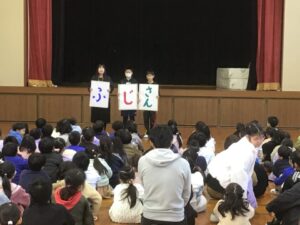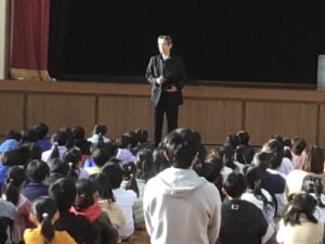 校長先生のお話から始まり、6年生児童によるこれまでの生活を振り返った発表のあと、生徒指導の先生から冬休みの生活に関する注意について話がありました。また、夏休み等の作品づくりにとりくみ入賞した児童の紹介をしました。