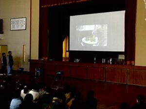 最初に校長先生の挨拶と動画による給食調理員さんの仕事見学