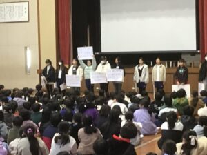 続いて保健集会では、睡眠の大切さについて保健委員が調べたことを発表。