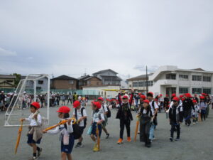 昨日の雨で心配された遠足ですが、鈴の森公園へむけて、何とか出発することができました。