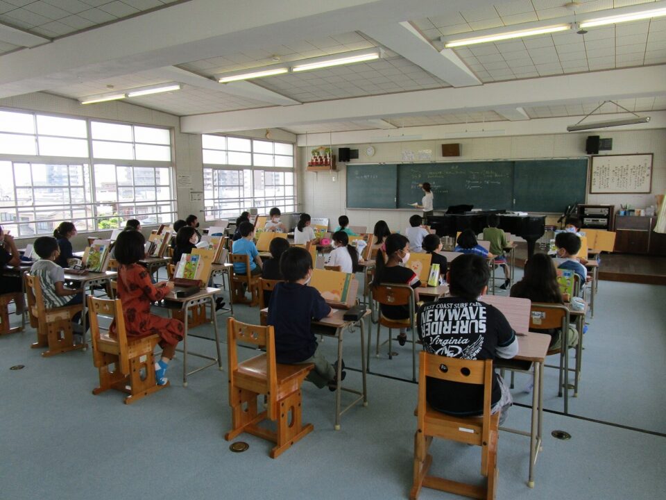4年生の音楽では、音楽室の窓を開け、換気をしながら、机も横の子とは105cm、前の子とは85cm、ななめの子とは135cm空けることになっています。