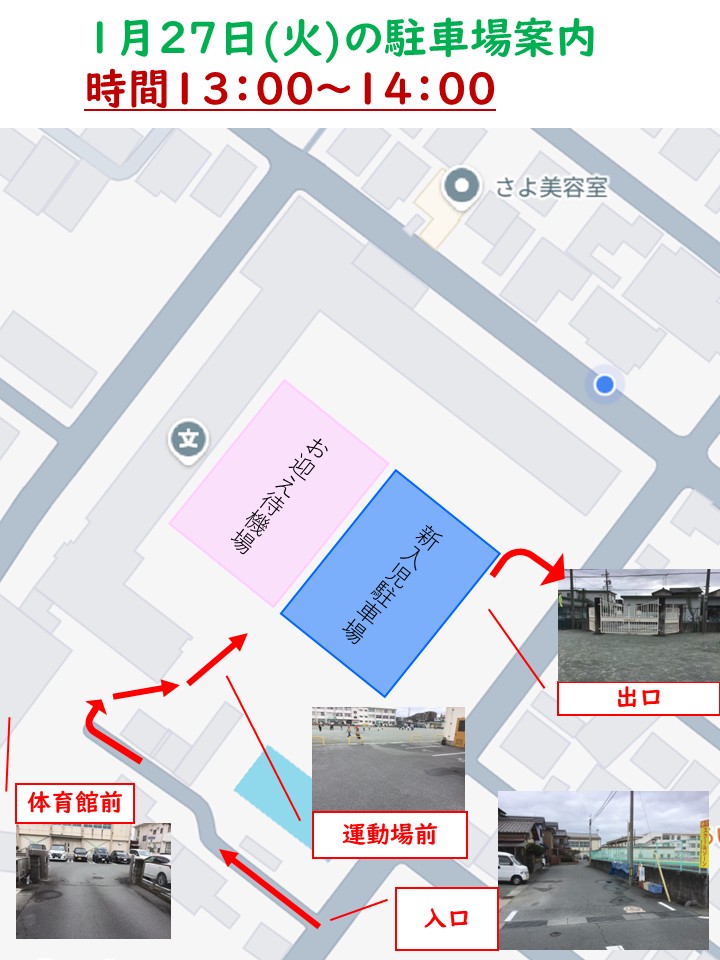 駐車場の案内です。明日の13:00~14:00の間は、一日入学の保護者の方が駐車場を使用するため、運動場を開放し、敷地内を一方通行とさせていただきます。